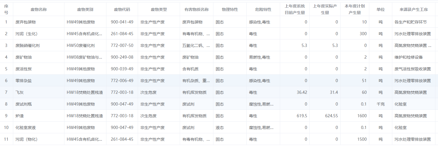 危廢種類(lèi):廢棄包裝物、污泥(物化)、廢脫銷(xiāo)催化劑、污泥(生化)、廢礦物油、廢活性炭、零排雜鹽、飛灰、廢試劑瓶、化驗(yàn)室廢液、爐渣。